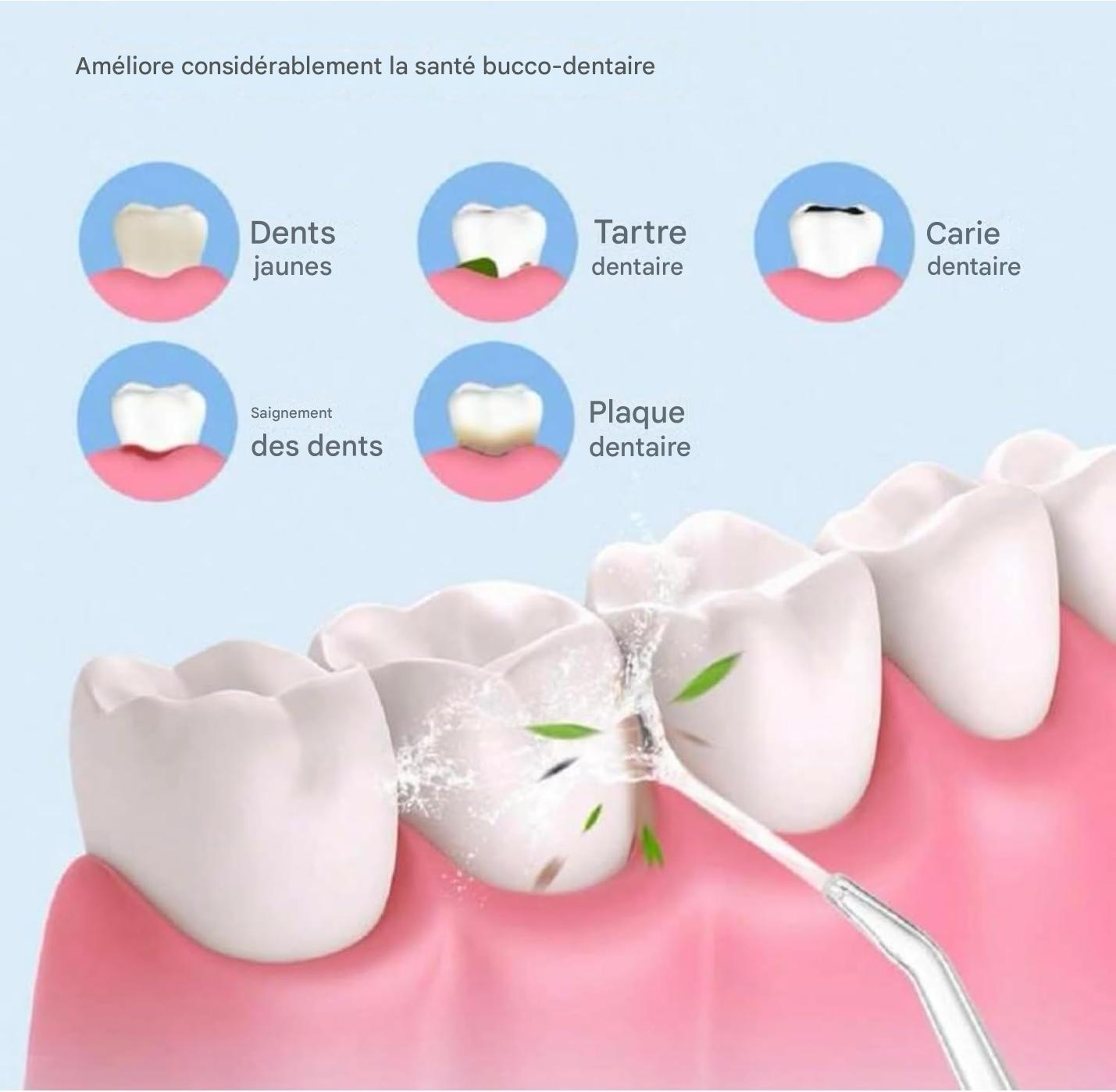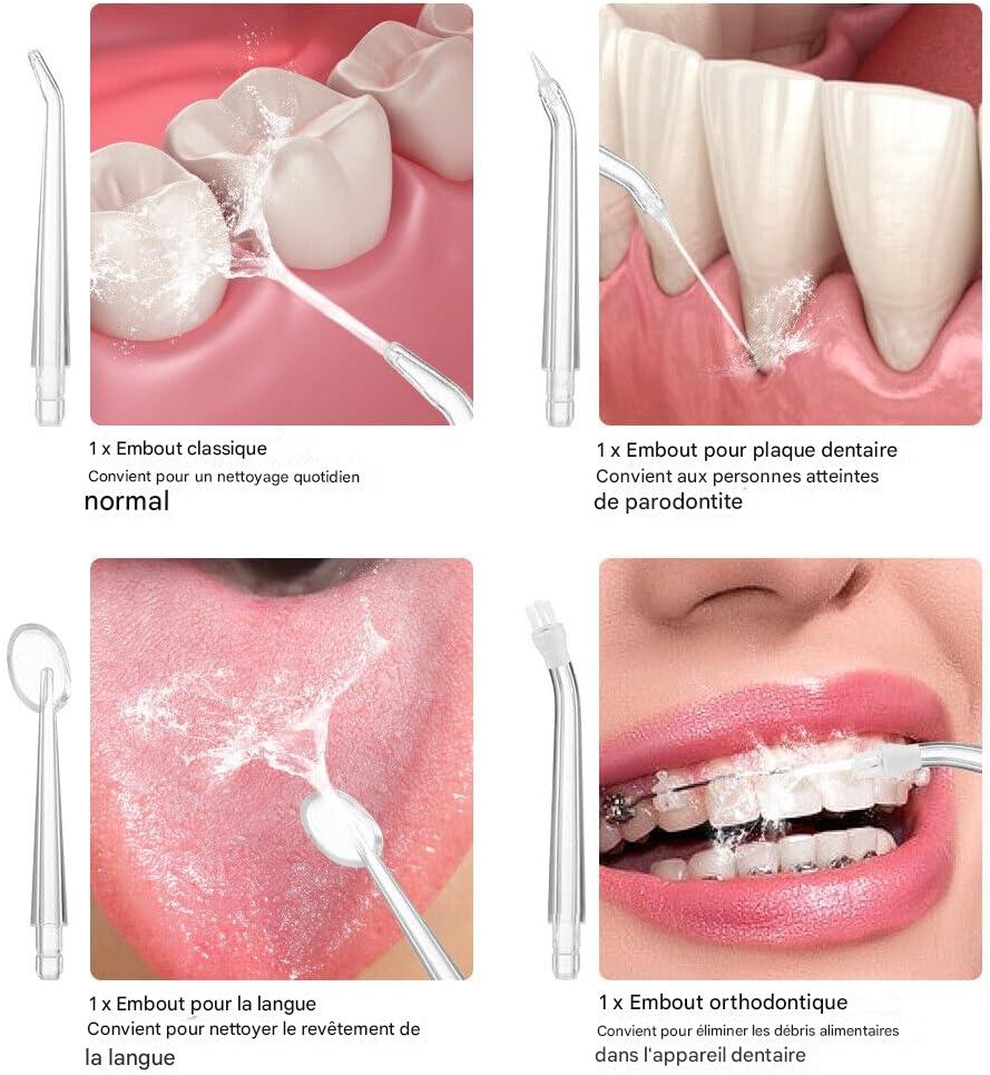 DĂ©couvrez le nettoyage en profondeur haute performance : notre hydropulseur dentaire utilise des impulsions puissantes de 700 Ă 1500 cycles par minute pour Ă©liminer efficacement la plaque et les dĂ©bris lĂ oĂč la brosse Ă dents ne peut pas aller.
